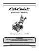 1 To The Owner Thank You Thank you for purchasing a Snow Thrower manufactured by Cub Cadet LLC. It was carefully engineered to provide excellent performance when properly operated and maintained. Please read this entire manual prior to operating the equipment. It instructs you how to safely and easily set up, operate and maintain your machine. Please be sure that you, and any other persons who will operate the machine, carefully follow the recommended safety practices at all times.