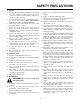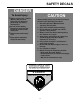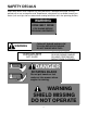 SAFETY DECALS DANGER CAUTION To Avoid Injury: • Always connect the “ground” (Black) cable last and remove it first whenever performing any battery maintenance. not contact battery • Do terminals or tools used to loosen the terminals with metal parts. contact with battery • Avoid acid. sparks and flames • Keep away from the battery. Serious bodily injury may result from failure to follow safe operating procedures. 1. Read the Operators Manual before operating this machine. 2.