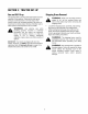 SECTION5: OPERATING YOURLAWNTRACTOR WARNING: WARNING AVOIDSERIOUS INJURYORDEATH • • • • • • • • • • • • GO UP AND DOWN SLOPES, NOT ACROSS. AVOID SUDDEN TURNS. DO NOT OPERATE THE UNIT WHERE IT COULD SLIP OR TIR IF MACHINE STOPS GOING UPHILL, STOP BLADE(S) AND BACK DOWNHILL SLOWLY. DO NOT MOW WHEN CHILDREN OR OTHERS ARE AROUND. NEVER CARRY CHILDREN, EVEN WITH BLADES OFR LOOK DOWN AND BEHIND BEFORE AND WHILE BACKING. KEEP SAFETY DEVICES (GUARDS, SHIELDS, AND SWITCHES) IN PLACE AND WORKING.