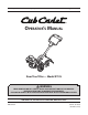 Safe Operation Practices • Set-Up • Operation • Maintenance • Service • Troubleshooting • Warranty Operator’s Manual Rear Tine Tiller — Model RT 35 WARNING READ AND FOLLOW ALL SAFETY RULES AND INSTRUCTIONS IN THIS MANUAL BEFORE ATTEMPTING TO OPERATE THIS MACHINE. FAILURE TO COMPLY WITH THESE INSTRUCTIONS MAY RESULT IN PERSONAL INJURY. CUB CADET LLC, P.O. BOX 361131 CLEVELAND, OHIO 44136-0019 Printed In USA Form No.