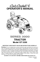 OPERATOR’S MANUAL SERIES 3000 TRACTOR Model GT 3200 IMPORTANT: READ SAFETY RULES AND INSTRUCTIONS CAREFULLY Warning: This unit is equipped with an internal combustion engine and should not be used on or near any unimproved forest-covered, brush-covered or grass-covered land unless the engine’s exhaust system is equipped with a spark arrester meeting applicable local or state laws (if any). If a spark arrester is used, it should be maintained in effective working order by the operator.