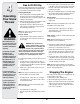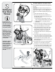 3 Setting Up Your Snow Thrower This Operator’s Manual may cover a range of product specifications. Characteristics and features discussed and/or illustrated in this manual may not be applicable to all models. IMPORTANT: Two replacement auger shear pins are included with this manual (or stowed in the plastic handle panel). Refer to “Augers” section in the Maintenance section for more information regarding shear pin replacement. 1. Remove the unit from the crate or carton. ! 2.