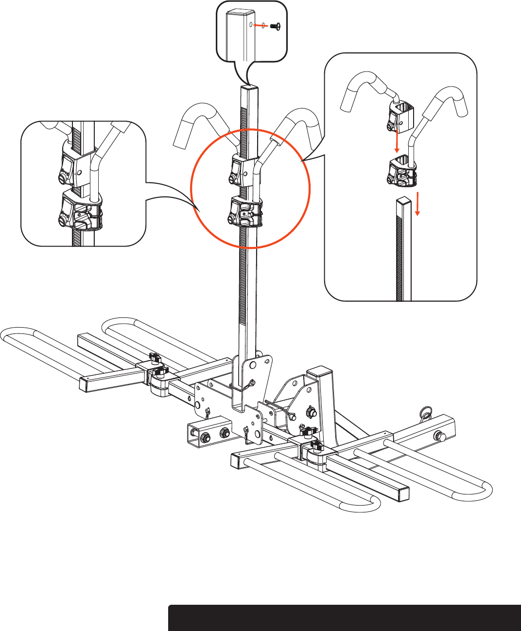 Slide the long locking arm (#7) onto the middle arm of the main body rack (#1), making sure the locking arm is facing