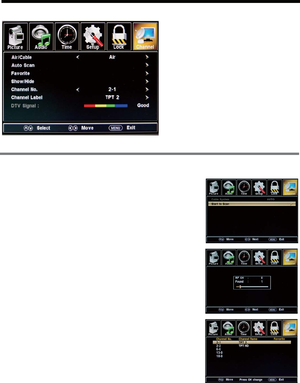 If you selet “Cable”, the following items(Favorite, Show/Hide, Channel NO, Channel Label and