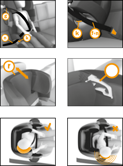 der Diagonalgurt (f) durch die rot markierte Gurtführung (g) der Schulterstütze