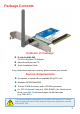 Technical Specifications Standards ! IEEE 802.11b Temperature ! Operating: 32ºF to 131ºF (0ºC to 55ºC) ! Storing: -4ºF to 167ºF (-20ºC to 75ºC) Humidity: ! Operating: 10% - 90%, non-condensing ! Storage: 5% - 95%, non-condensing Antenna Type: ! Dual UFL antenna with reverse SMA connector Emissions: ! FCC part 15c Physical Dimensions: ! L = 6.10 inches (155mm) ! W = 5.51 inches (140mm) ! H = .90 inches (23mm) Weight: ! .20 lbs. (90g) Bus Type: ! PCI 2.