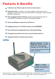 Technical Specifications Standards: IEEE 802.11 IEEE 802.11b IEEE 802.11g IEEE 802.3 Ethernet IEEE 802.3u Port: 10/100 Mbps Fast Ethernet Auto MDI/MDIX Data Rates with Automatic Fallback:1 54Mbps 22Mbps 11Mbps 5.5Mbps 2Mbps 1Mbps Encryption: 64-bit RC4 128-bit RC4 Media Access Control: CSMA/CA with ACK Frequency Range: 2.4GHz to 2.4385GHz Operating Range:2 Indoors – Up to 328 ft.