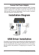 Connect the Power Adapter • Complete the process by connecting the supplied 12VAC, 1A power adapter to the POWER connector on the back of the device and plug the adapter into a wall outlet or power strip. Then turn on and boot up your PC and any LAN devices, such as hubs or switches, and any computers connected to them. Installation Diagram USB Driver Installation To connect your computer to the modem by the USB cable instead of the Ethernet cable, you will need to install the modem’s USB driver.