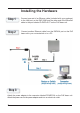 Installing the Hardware Step 1 Connect one end of an Etherne cable (included with your package) to the LAN port on the DAP-3220 and the other end of the Ethernet cable to the port labeled P+DATA OUT on the PoE base unit. Step 2 Connect another Ethernet cable from the DATA IN port on the PoE base unit to your router/switch or to a PC. Step 3 Attach the power adapter to the connector labeled POWER IN on the PoE base unit. Attach the power cord to the power adapter and into an electrical outlet.