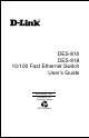 10/100 Fast Ethernet Switch User’s Guide 1 2 O VERVIEW Introduction The DES-810 and DES-818 Fast Ethernet Switches are ideal for network managers who want to boost workgroup performance easily by microsegmenting a 10Mbps LAN while adding 100Mbps links. They are also excellently suited to provide dedicated Fast Ethernet connections to key network servers. Each switch integrates 100Mbps Fast Ethernet with 10Mbps Ethernet networks seamlessly.