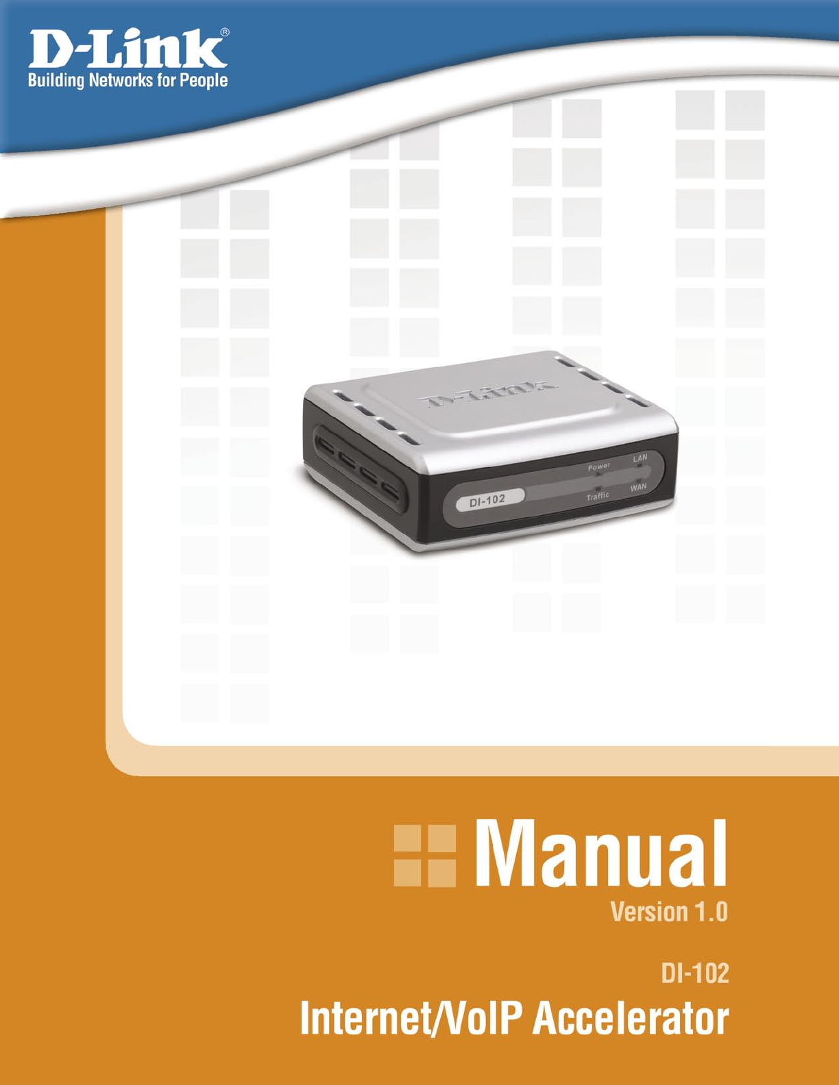 DI-102 User’s Manual Package Contents Package Contents D-Link StreamEngine™ DI-102 Internet/VoIP Accelerator Power Adapter-5.0V DC, 2A Manual, QIG and Warranty on CD Ethernet Cable Straight-through Note: Using a power supply with a different voltage than the one included with the DI-102 will cause damage and void the warranty for this product. If any of the above items are missing, please contact your reseller.