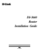 DI-3660 Router Router Installation Before you Begin Warning: Only trained & qualified technician is allowed to install & maintain the equipment This Chapter instructs you on how to install the D-Link DI-3660 Series Router. The Chapter is divided into following sections:• • • • • • • Unpacking the Router. Safety Warnings and Recommendations. Tools and equipments required for installation. Installing the Router Case. Connecting Power to the Router. Connecting to the Console & Auxiliary Port of the Router.