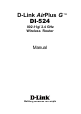 Package Contents Contents of Package: D-Link AirPlus G DI-524 802.11/2.4GHz Wireless Router Switching 5V/1.2A Full-Range US Type Manual and Warranty on CD Quick Installation Guide Ethernet Cable (All the DI-524’s Ethernet ports are Auto-MDIX) Note: Using a power supply with a different voltage rating than the one included with the DI-524 will cause damage and void the warranty for this product. If any of the above items are missing, please contact your reseller.