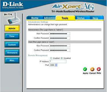 Using the Configuration Menu (continued) Tools> Admin (continued) Remote Management Remote Management allows the DI-774 to be configured from the Internet by a web browser. A username and password is still required to access the Web-Management interface. In general, only a member of your network can browse the built-in web pages to perform “Administrator” tasks. This feature enables you to perform “Administrator” tasks from the remote (Internet) host.
