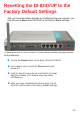 Resetting the DI-824VUP to the Factory Default Settings After you have tried other methods for troubleshooting your network, you may choose to Reset the DI-824VUP to the factory default settings. To hard-reset the D-Link DI-824VUP to the Factory Default Settings, please do the following: Locate the Reset button on the back of the DI-824VUP. Use a paper clip to press the Reset button and power on. Hold for about 5 seconds (do not hold for too long) and then release. (Or, release when the status LEDflashes.