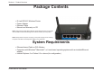 Section 1 - Product Overview Package Contents • D-Link DIR-615 Wireless Router • Power Adapter • Ethernet Cable • Manual and Warranty on CD Note: Using a power supply with a different voltage rating than the one included with the DIR-615 will cause damage and void the warranty for this product. Note: Always attach the power cord plug to the power supply, before inserting the power cord and connected power supply to the wall outlet.