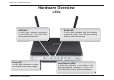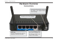 Section 1 - Product Overview Hardware Overview LEDs INTERNET A solid light indicates connection on the WAN port. This LED blinks during data transmission. Power LED A solid light indicates a proper connection to the power supply. D-Link DIR-615 User Manual WLAN LED A solid light indicates that the wireless segment is ready. This LED blinks during wireless data transmission. Local Network LEDs A solid light indicates a connection to an Ethernet-enabled computer on ports 1-4.