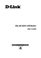 DSL-200 ADSL USB Modem User’s Guide Trademarks Copyright 2000 D-Link Corporation. Contents subject to change without prior notice. D-Link is a registered trademark of D-Link Corporation/D-Link Systems, Inc. All other trademarks belong to their respective proprietors. Copyright Statement No part of this publication may be reproduced in any form or by any means or used to make any derivative such as translation, transformation, or adaptation without permission from D-Link Corporation/D-Link Systems Inc.
