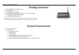 Section 1 - Product Overview Package Contents • • • • • • DSL-2640U Wireless ADSL Router Power Adapter CD-ROM with User Manual One twisted-pair telephone cable used for ADSL connection One straight-through Ethernet cable One Quick Installation Guide Note: Using a power supply with a different voltage rating than the one included with the DSL-2640U will cause damage and void the warranty for this product.