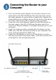 Connecting the Router to your Computer 1. 2. 3. 4. First, connect the power adapter to the power socket on the back panel of the DSL-2740B and then plug the other end of the power adapter to a wall outlet or power strip. Depress the Power Button to turn ON the device. On the front of the device, the Power LED will turn ON to indicate proper operation.
