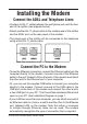 Installing the Modem Connect the ADSL and Telephone Lines • Connect an RJ-11 cable between the wall phone jack and the lineend of the splitter (see diagram below). • Attach another RJ-11 phone cable to the modem-end of the splitter and the ADSL port on the rear panel of the modem. • The phone-end of the splitter will be connected to the telephone using a third RJ-11 phone cable. Note: See connections on the installation diagram.