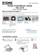 Guide d’installation rapide DSL-321B ADSL2+ ETHERNET MODEM Que contient la boîte ? En l'absence de l'un des éléments suivants, contactez votre revendeur. DSL-321B CD-ROM Câble Ethernet MODEM D-Link Click’n Connect, (UTP cat. 5) ETHERNET ADSL2+ guide d'installation rapide et certificat de garantie Adaptateur d’alimentation Câble RJ-11 Remarque : l'utilisation d'une alimentation électrique d'une tension différente endommagera ce produit et entraînera la nullité de la garantie.