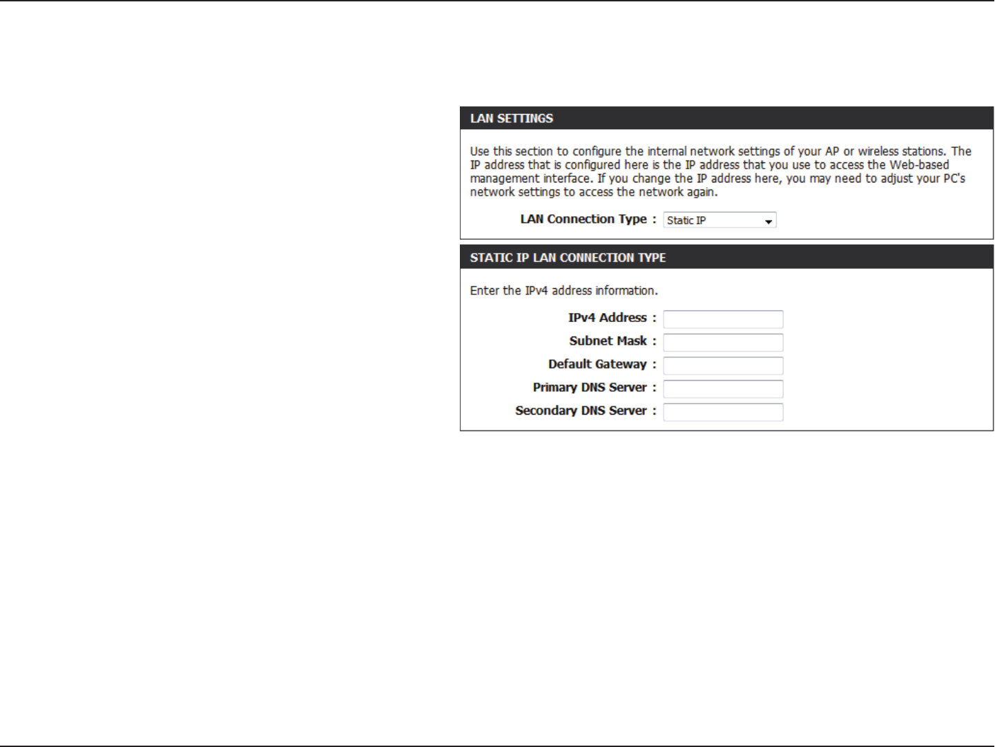 Select Static IP to manually enter the IP address, subnet mask, and default gateway addresses.