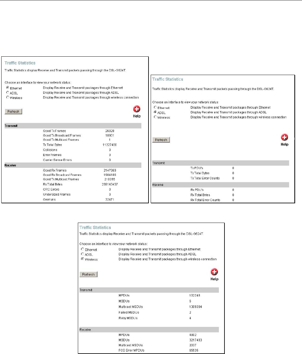 Use the Traffic Statistics window to monitor traffic on the Ethernet, ADSL or Wireless Internet connection. Select the