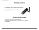 Section 1 - Product Overview Product PackageOverview Contents • D-Link DWA-126 High-Power Wireless N 150 USB Adapter • Cradle • Manual and Warranty on CD • D-Link Wireless Connection Manager on CD • Quick Installation Guide System Requirements • A computer or laptop with an available USB 2.0 port • Windows Vista®, 2000 (Service Pack 4), XP (Service Pack 2), or Windows 7 • CD-ROM Drive • 300MHz processor and at least 64MB of RAM • A 802.11n or 802.