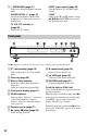 G i SURROUND (page 41) INPUT (input select) (page 28) Turns on or off the headphone surround mode. Switches between TV and other input sources. PHONE LEVEL +/– (page 41) LIGHT Adjusts the headphone volume when headphones are connected and a disc is being played. Lights up the 5 and 6 buttons (except