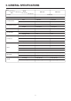 2. GENERAL SPECIFICATIONS MODEL DWC-070C ITEM Function DWC-091C Cooling only Power source AC 115V, 60Hz, Single phase Btu/h 7,390 Btu/h 9,000 Btu/h Kcal/h 1,862 Kcal/h 2,268 Kcal/h Btu/wh 10.0 Btu/wh 9,6 Btu/wh Kcal/wh 2.52 Kcal/wh 2.42 Kcal/wh Pts/h 2.36 Pts/h 3.04 Pts/h Power Input 739 W 938 W Running Current 7.2A 9.