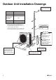 Outdoor Unit Installation Drawings Wrap the insulation pipe with the finishing tape from bottom to top. Max. allowable length 15m * Min. allowable length 1.5m Max. allowable height 12m Additional refrigerant required for refrigerant pipe exceeding 10m in length. 20g/m Gas pipe O.D. 9.5mm Liquid pipe O.D. 6.4mm * Be sure to add the proper amount of additional refrigerant. CAUTION Failure to do so may result in reduced perfomance. * The suggested shortest pipe length is 1.
