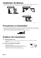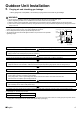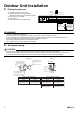 Outdoor Unit Installation 5. Purging air and checking gas leakage. • When piping work is completed, it is necessary to purge the air and check for gas leakage. WARNING 1) 2) 3) 4) Do not mix any substance other than the specified refrigerant (R410A) into the refrigeration cycle. When refrigerant gas leaks occur, ventilate the room as soon and as much as possible. R410A, as well as other refrigerants, should always be recovered and never be released directly into the environment.