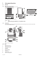 3.1 DHP-AX 3.1.1 Dimensions and connections The stand shown in the image is an accessory. 661 Heat pump information 76 1250 3 495 405 773 1 243 1167 2 325 Figure 1: DHP-AX, dimensions and connections. Position 1 2 3.1.2 Name Supply line heating system, DHP-AX 6, 8, 10: 22 Cu, DHP-AX 12: 28 Cu Return line heating system, DHP-AX 6, 8, 10: 22 Cu, DHP-AX 12: 28 Cu Components The component image below shows diagrammatically how the heat pump looks inside.
