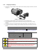 Press switch and wait until all LED’s are off Plug the AC power adapter into the printer. Press ; the green LED is illuminated and after about 20 seconds the LED should go off If the amber LED is on, this will continue on through this test indicating that the battery is accepting a charge and that the charge circuit is ok. At the end of a 180 minute charge cycle the LED will go off. 4.4 Battery and Safety Information The printer is powered by a 7.4V Li-Ion battery cartridge.