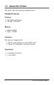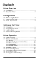 Printer Overview 1.0 Introduction ...................................................................1 1.1 About this Printer ..........................................................2 Getting Started 2.0 Before using the Printer ................................................3 2.1 Inspecting the Printer ....................................................3 2.2 Media Requirements.....................................................4 Setting up the Printer 3.0 3.1 3.2 3.3 Introduction ..................