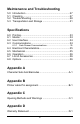Maintenance and Troubleshooting 5.0 5.1 5.2 5.3 Introduction .................................................................27 Cleaning......................................................................27 Trouble Shooting.........................................................28 Transportation and Storage ........................................31 Specifications 6.0 6.1 6.2 6.3 Printing........................................................................33 Media .................................