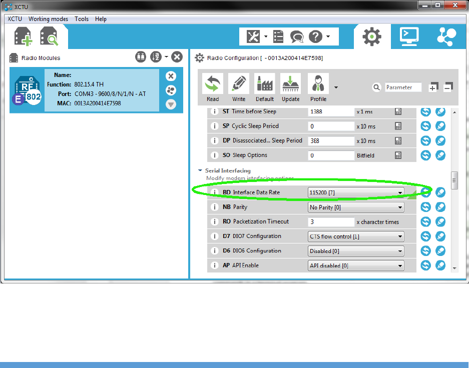 1. Change the baud rate on the XBee module through the data COM port using AT commands or