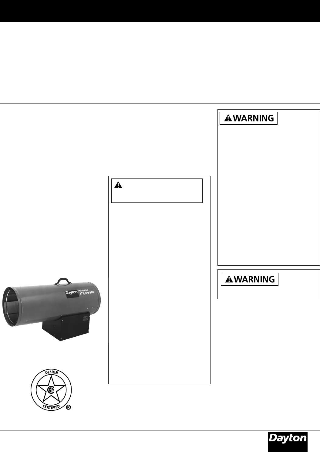 Dayton propane construction heater is variable 223,000 to 375,000 BTU/Hr with a