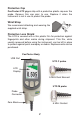 Language Converts displayed and printed words to the selected language. Statistics Mode ü x Statistics A statistical summary will appear on the display. Remove the last measurement by pressing the (-) button. Press (+) to clear statistics. Standard Mean (average) Deviation # of measurements Maximum measurement Minimum measurement Last reading Statistics Icon HiLo Alarm x mm ü Allows the Gage to visibly and audibly alert the user when measurements exceed user-specified limits.
