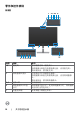 零件和控件辨别 前视图 1 2 3 45 6 7 8 9 10 11 12 标签 1,6 描述 麦克风 3 网络摄像头镜头 2,4 5 红外LED 网络摄像头LED指 示灯 内置扬声器 7 10 | 关于您的显示器 7 13 使用 显示器麦克风(麦克风)。 网络摄像头和麦克风模块弹出后,启用麦克风。 模块收回后,禁用麦克风。 在视频会议中传输您的图像。 网络摄像头和麦克风模块弹出后,启用网络摄像 头。 模块收回后,禁用网络摄像头。 红外指示灯 网络摄像头指示灯。使用网络摄像头时,网络摄像 头指示灯会亮起白光。 从音频输入端输出声音。