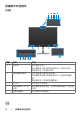 仰視圖 9 14 1 2 3 4 5 6 7 8 9 10 11 12 13 標籤 說明 用途 1 安全鎖插槽 用安全纜線鎖(另售)固定顯示器。 2 電源連接器 連接電源線。 3 HDMI 連接埠 用 HDMI 纜線連接電腦。 4 DP 連接器(輸 入) 用 DisplayPort 纜線連接電腦。 5 USB Type-C 上游 DisplayPort 使用 USB Type-C 纜線連接至電腦。 USB Type-C 連接埠提供最快傳輸速率 (USB 3.2 Gen 1) 和 DP 1.2 交替模式 (C2422HE/C3422WE) / DP 1.4 (C2722DE) 支援下列解析度,以及 PD 20 V/4.