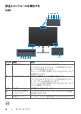 RJ45コネクタのLEDステータス: Right LED Left LED LED 右LED カラー 説明 緑色 リンク / アクティビティインジケーター: • 点滅 - ポートでアクティビティ中。 • 緑色に点灯 - リンクを確立しています。 • 消灯 - リンクが確立されていません。 黄色または緑色 速度インジケーター: • 黄色に点灯 - 1000 Mbps • 緑色に点灯 - 100 Mbps • 消灯 - 10 Mbps 左LED 注意:RJ45 ケーブルは、付属の標準アクセサリではありません。 32 | モニターについて