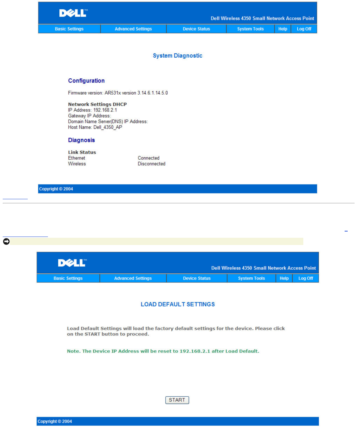 NOTICE:Loading the default settings option will cause the current settings for your Dell Wireless 4350 Small Network Access Point to be lost.