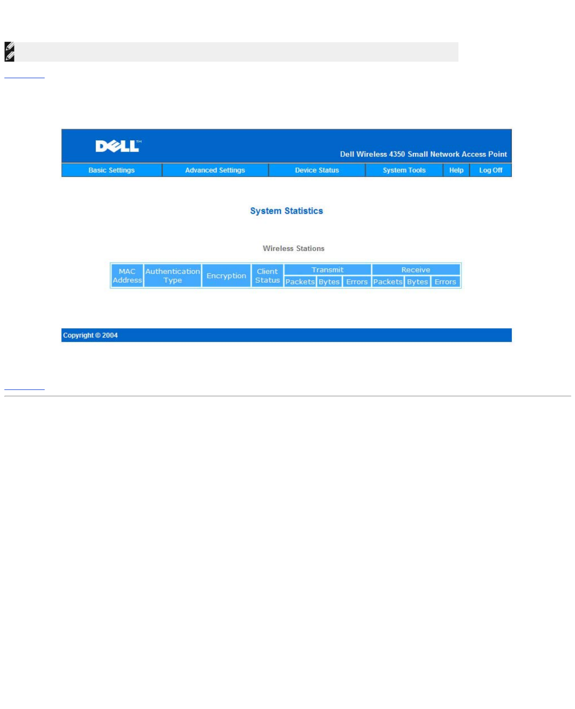 The System Statistics table displays diagnostic information on all the wireless stations currently connected to the Dell Wireless 4350 Small Network Access Point.