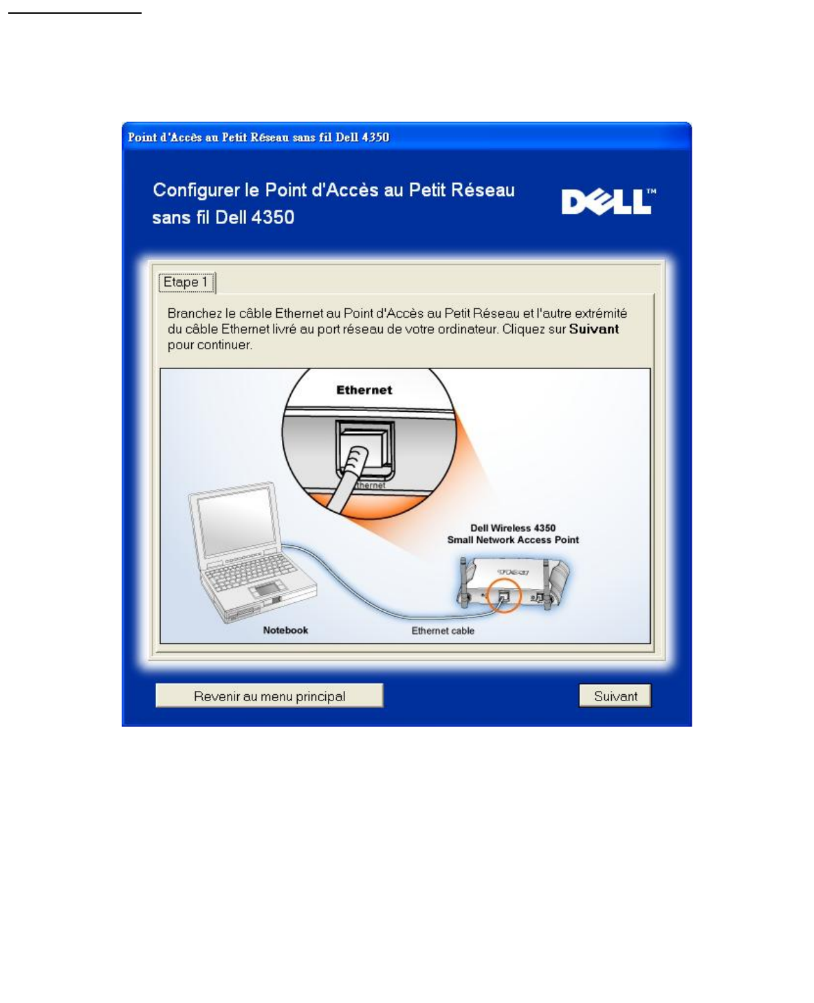 L'étape 1 illustre la façon de connecter l'ordinateur au Point d'Accès de Petit Réseau Dell 4350.