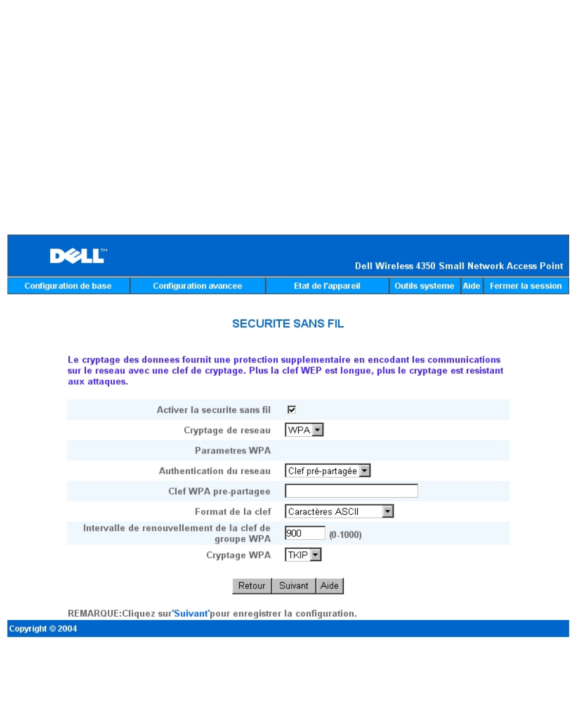 utilisée. AES (Advanced Encryption Standard) peut être utilisé si vos clients sans fil ne prennent pas en charge TKIP.