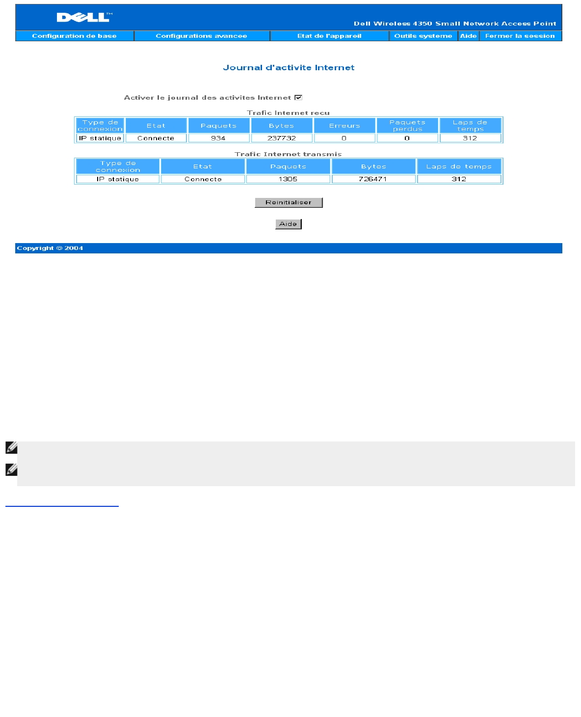 Le Point d'Accès de Petit Réseau sans fil Dell 4350 permet à l'utilisateur d'enregistrer les paramètres de configuration actuelles dans un