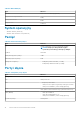 Tabela 5. Zewnętrzne porty i złącza(cd.) Opis Wartości Port dokowania Jedno złącze zewnętrznej grafiki UWAGA: Złącze zewnętrznej grafiki jest zgodne z urządzeniem Alienware Graphics Amplifier. Złącze zasilacza Jedno wejście prądu stałego 7,4 mm x 5,1 mm Security (Zabezpieczenia) Jedno gniazdo linki zabezpieczającej (blokada klinowa) Tabela 6. Wewnętrzne porty i złącza Opis Wartości Wewnętrzne: M.2 • • Jedno gniazdo M. 2 na dysk SSD 2230/2280 SATA AHCI/PCIe NVMe Jedno gniazdo M.