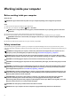 Working inside your computer Before working inside your computer About this task NOTE: The images in this document may differ from your computer depending on the configuration you ordered. Steps 1. Save and close all open files and exit all open applications. 2. Shut down your computer. Click Start > Power > Shut down. NOTE: If you are using a different operating system, see the documentation of your operating system for shut-down instructions. 3.
